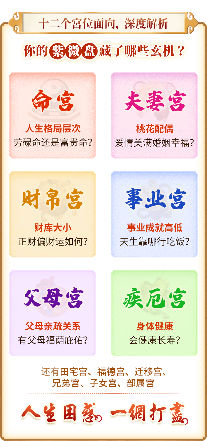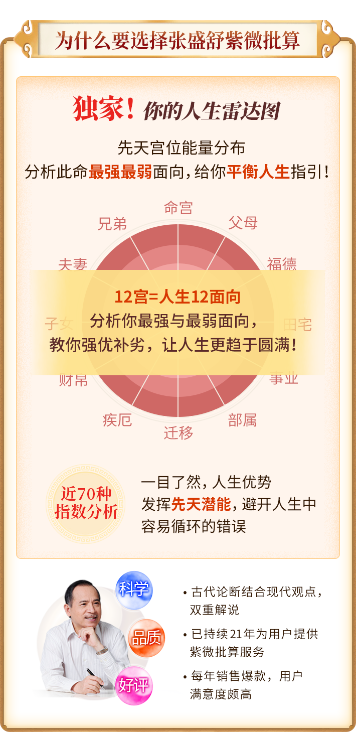 紫微斗数是东方中国最著名的占星学,利用人类出生时夏历时间进行斗数星盘的排列,将满天星曜飞布人生十二宫,并据以解释人生命运起伏,紫微斗数经老师团队多年研究,准确率高达95%!